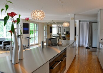 Küche mit Schiebetüren und verglaster Trennwand