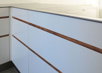 Wunderschöne Kombination lackierter Fronten, Chromnickelstahl, Keramik, Holz und LED